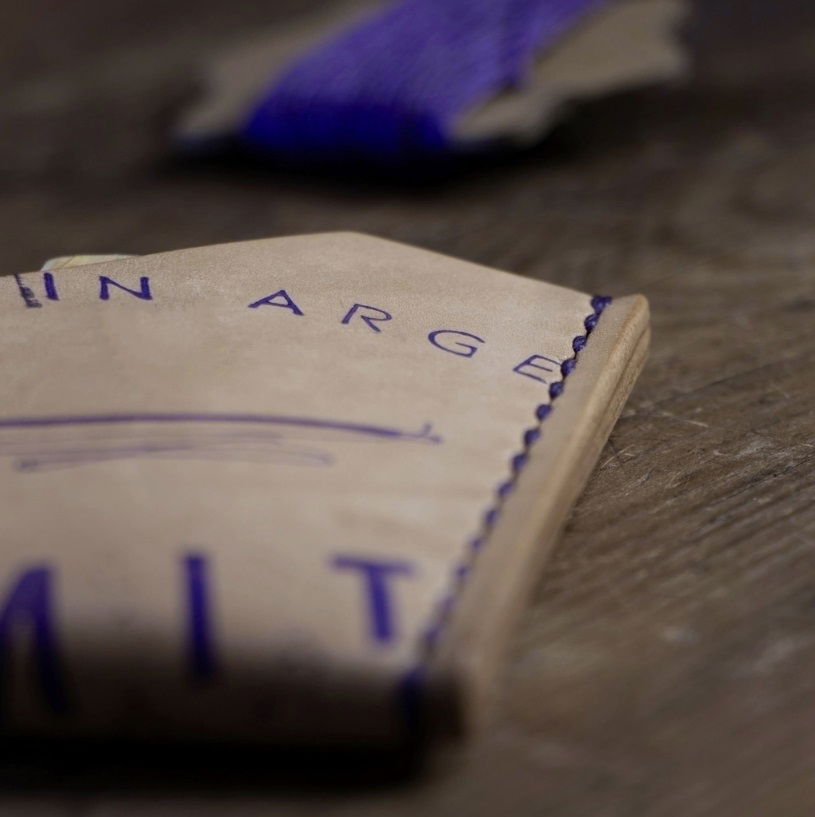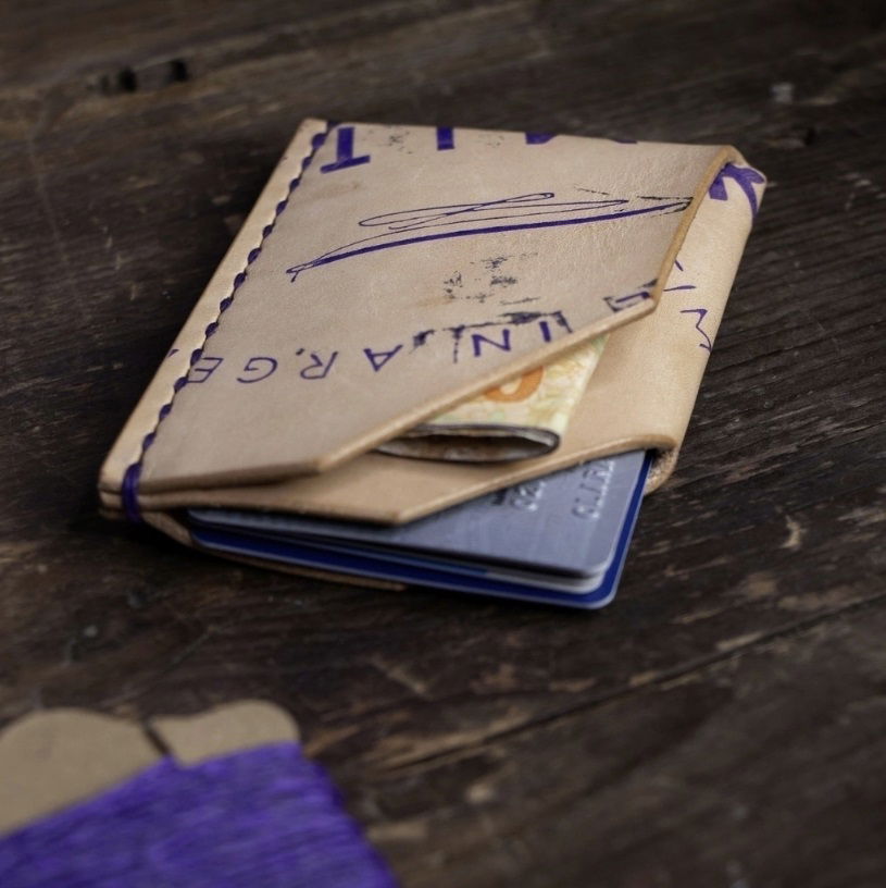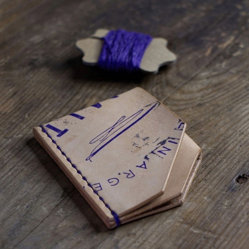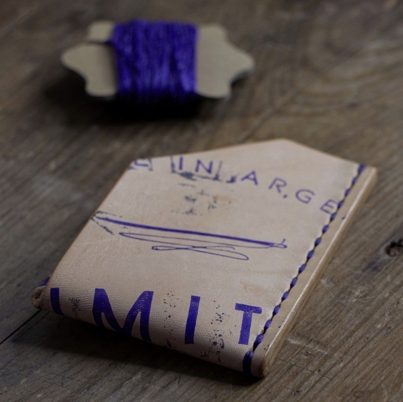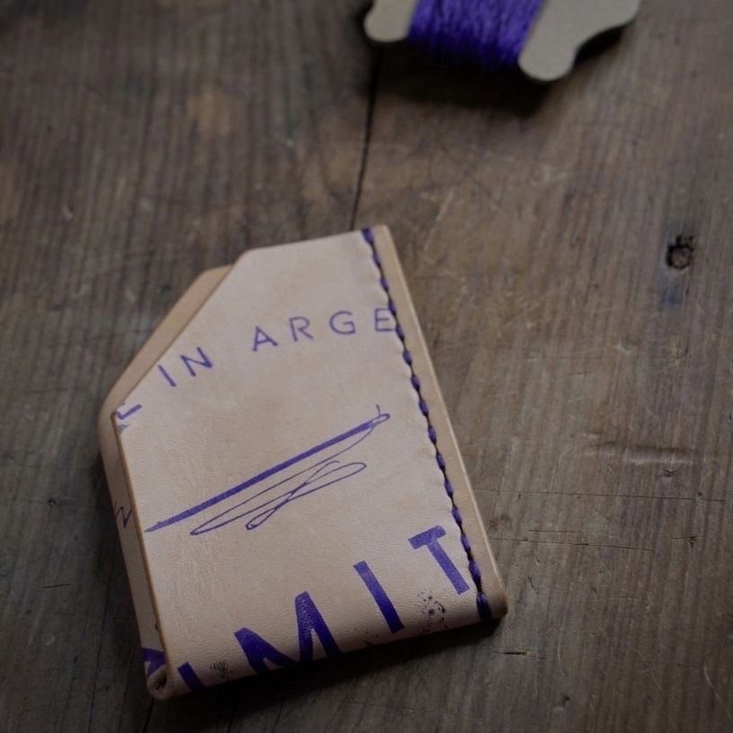 - Versión con estampa en púrpura sobre cuero natural y costura al tono